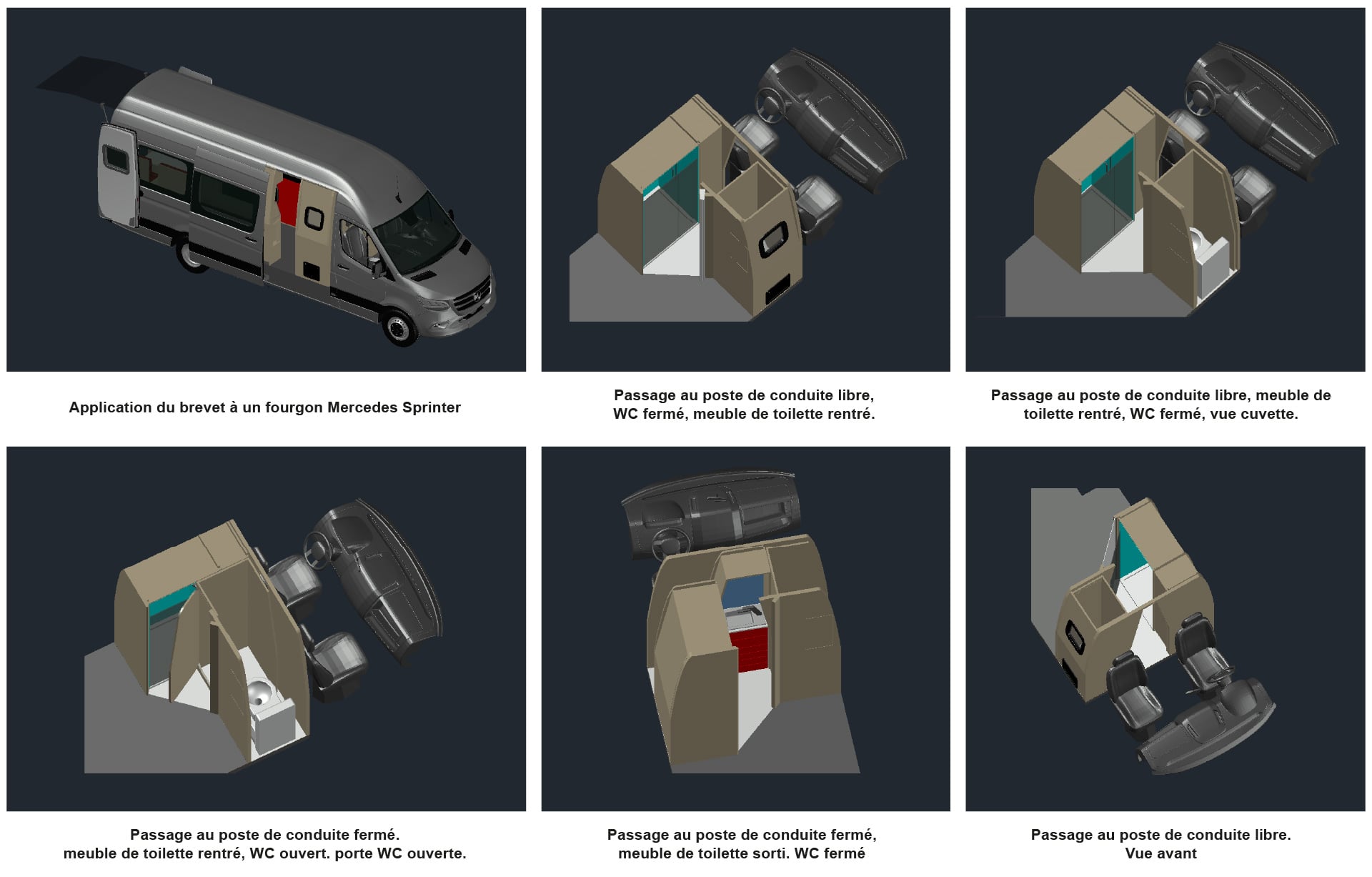 L’aménagement de son espace intérieur est applicable à tous les camping-cars et fourgons aménagés. Il a fait l’objet d’un brevet international concernant quatre dispositifs distincts :